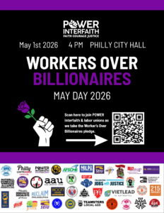 Join POWER Interfaith, partnering with the Philadelphia AFL-CIO and over 20 different labor unions and community organizations, for the Workers over Billionaires Rally, where we will declare our vision for a Philadelphia that prioritizes regular, working people, over billionaires. We will gather on Friday, May 1st, at 4 PM at Philadelphia City Hall.